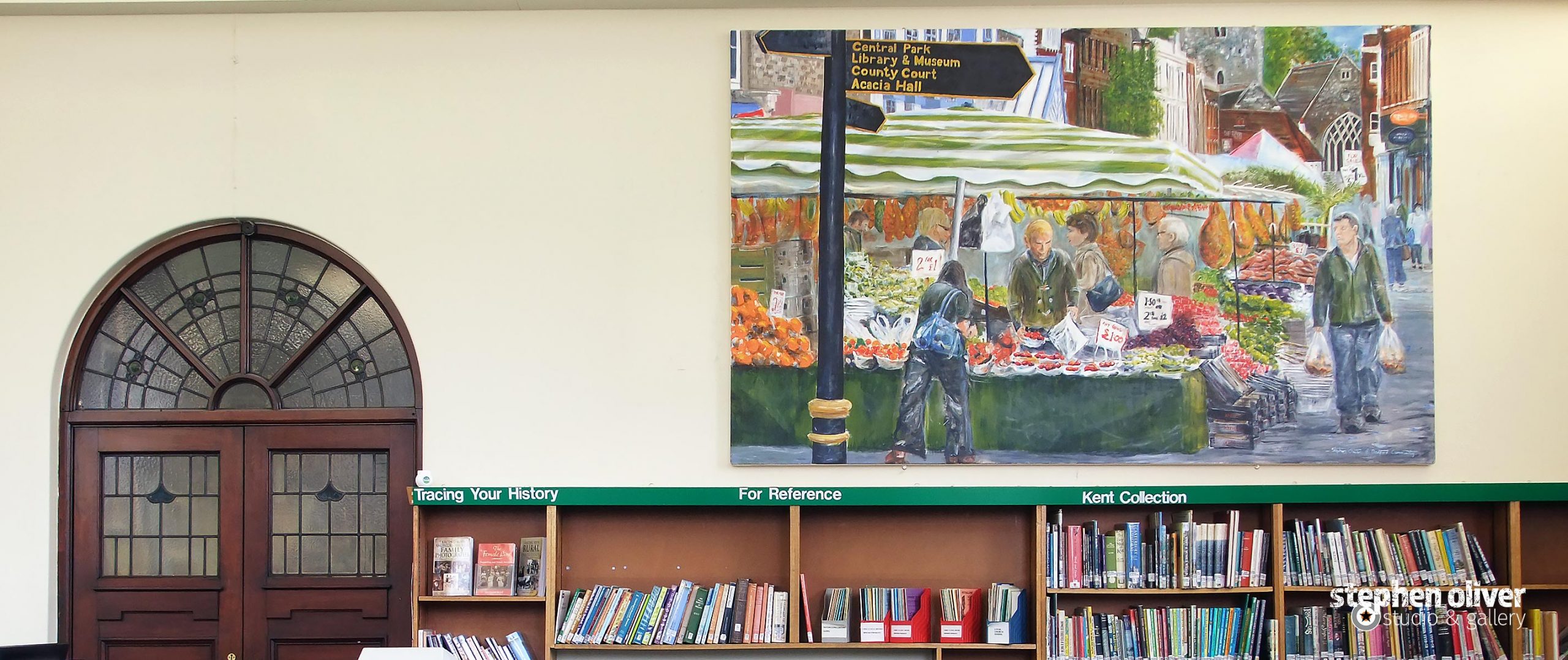 Painting finished, varnished, and hangers fitted, it was now ready to be carried to it’s permanent home in Dartford Library (a distance of around ¾ of a mile). I had agreed with the library to have the artwork installed in time to be unveiled on 8 February, National Libraries Day 2014. On Tuesday, 4 February the weather in Dartford, as well as the rest of the country, had been atrocious, and the forecast said it was going to get worse. With heavy rain and hurricane winds predicted for tomorrow, our planned moving day, manhandling the canvas across to the library was now out of the question. I decided to put out a call for help on Twitter – thanks to a generous offer by Practical Dartford, a local car and van rental company, we were able to safely transport the painting in one of their vans.